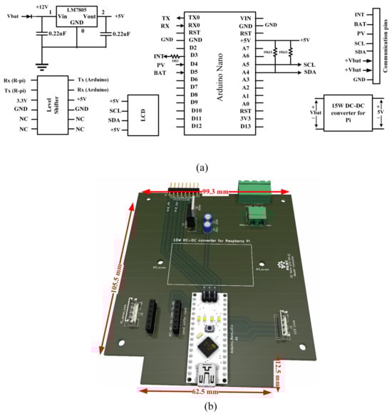 The shared digital pins are always connected to each converter to change their mode of operation. The master controller simultaneously requests voltage, current, and battery SOC data from the battery and load converters. The corresponding converters send back the data, which the master controller then combines sequentially and serially prints to the Raspberry Pi-based GUI and data logger. The circuit and the PCB design of the master controller are shown in Figure 12 and Figure 13.