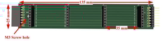 The communication bus comprises 8 lines used for I2C communication, shared digital pins, and power supply (+12 V, GND) shown in Figure 14. It features an 8-pin socket to interface with the pin headers of the converters and master controller, facilitating information exchange among the converters and the master controller and function of each trace is provided in Table 4. The bus is 25 mm in height and is placed inside the DIN rail where the converters communication pins clip in. Pin sockets are spaced 35 mm apart, and two communication buses can be interconnected to cover the full length of the DIN rail, as shown in Figure 15.