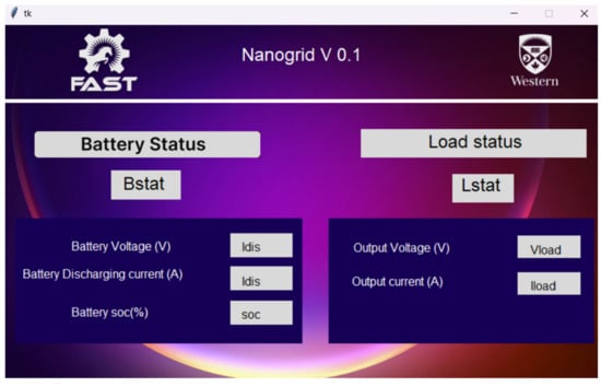 The graphical user interface (GUI) for the nanogrid system operates by receiving real-time data from a master Arduino via serial communication. These data, transmitted through a USB connection at a baud rate of 9600, are processed by a Raspberry Pi running a Python script using the Tkinter library. Currently, with only the battery converter and one load converter connected, the GUI is designed to display their statuses exclusively, including battery voltage, state of charge (SOC), battery discharging current, output voltage of load converter, and output current shown in Figure 16.