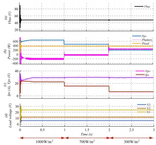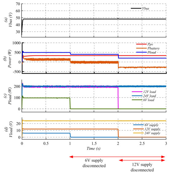 Last, a buck converter topology is used for loads of 24 V, 12 V, and 6 V, with each rated for a maximum of 400 W, 200 W, and 100 W, respectively, within the system. Ensuring that the bus voltage is stable at 48 V allows for loads rated at 48 V to be connected directly to the bus without any intermediary converters. The specifications of these modules, along with the PV, battery, and load ratings, are included in Table 2.