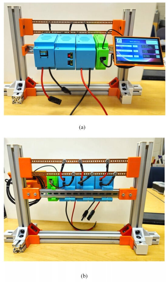 The components of the converter and the controller parameters are calculated and listed in Table 3 based on previous work on the mathematical modeling and system architecture of the nanogrid [30,67]. Components are chosen to exceed their critical ratings and are matched to the nearest common inductor and capacitor values. Based on these parameters, an open-source hardware nanogrid is designed and licensed under GNU GPL v3 [68] and CERN OHL v2—Strongly Reciprocal [69]. All code, GUI, 3D-printed parts, and converter PCBs are uploaded to an open-source repository [70].