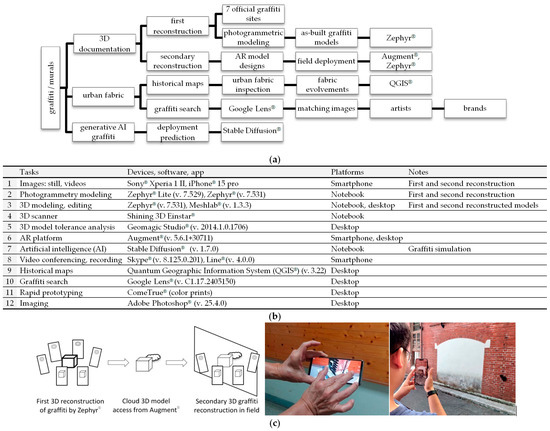 In this study, seven graffiti sites were investigated. This approach has three purposes, namely, providing a (1) survey of the evolving urban fabric; (2) creating a 3D documentation of graffiti in the field; and (3) reinterpreting the graffiti context using AR (Figure 2a), tools (Figure 2b), and processes (Figure 2c). The process presents an exploration of the spatial structure that is enhanced by graffiti, which is followed by personal, contact-free responses or engagement through the contribution of individuals’ own creations, with potentially governance-free involvement.