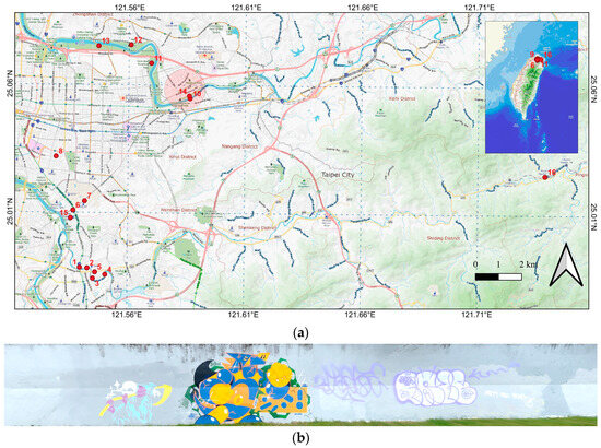 (a) Seven official sites and a number of observed occurrences around Taipei Metro; (b) three-dimensional documented field graffiti, as indicated no. 14 in the red circled area of (a).