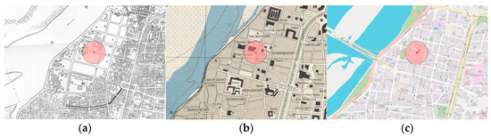 Evolved fabric exemplified from historical maps of (a) 1916 [48], (b) 1945 [48], (c) 2024 [48] around the circled area of graffiti site.