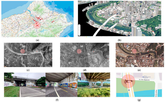 The evolving fabric around the Jingmei graffiti area (red circled area): (a) northern Taiwan; (b) 3D urban model; (c) 1947 aerial image [48]; (d) 1963 aerial image [48]; (e) 2003 Google® Maps image, where a new riverfront recreation area and bike routes have been added since 2011; (f) field scenes; and (g) aligning 3D point cloud model and QGIS® (Quantum Geographic Information System) within the circled area.