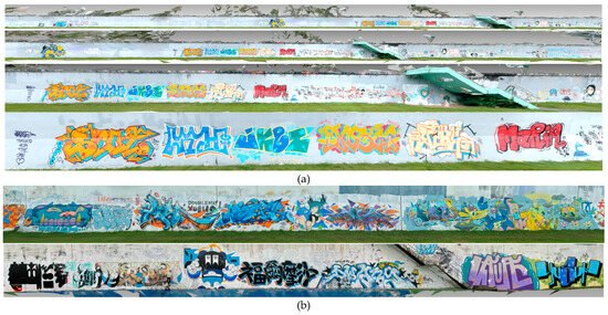 Three-dimensional models enable a thorough description of spatial structure, which is connected to the deployment of a complete set. All creations can be inspected across walls, on walls and the ground, and by prelude or postlude. In total, an area of nearly 7930 m2 was painted at the seven sites around Taipei Metro [16], as well as at a number of adjacent sites (Figure 3a). Field graffiti was documented in 3D models (Figure 3b) as an extension of the fabric. A series of pictures were taken on ground level to cover walls, building facades, or entire blocks. The models have detailed visual details (textures) and structural details for off-site inspections.