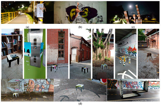 Field deployments of first reconstructed models: (a) graffiti on utility box using last-name characters; (b) foreground and background differentiation using 3D-scanned wood texture; (c) graffiti with the moon in the Mid-Autumn Festival; and (d) offsite and field deployment using seats and frames of different textures and forms to join the conversation made with existing graffiti or the environment.