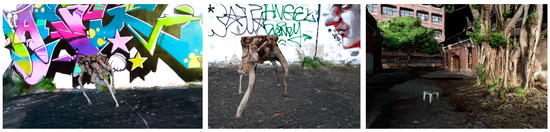 Three-dimensional graffiti were applied in reality (Figure 9) using specific designs (Figure 10). Subjected to situated themes, it acts as a self-created 3D virtual sticker that can be downloaded onsite. It was easy to scale, rotate, and move. A parallel side-by-side layout was the most straightforward composition. Multiple stickers were composed in balance, negative space, or symmetry with context already applied by former artists. It took less than five minutes to finish one AR scene, which can be preserved for future reference.