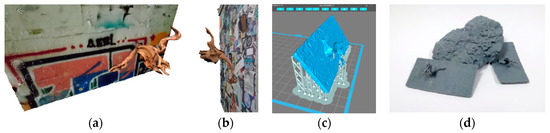 (a) Model of 3D graffiti with the background; (b) model of 3D graffiti with sticker board on the background; (c) 3D printing interface; and (d) 3D-printed results.