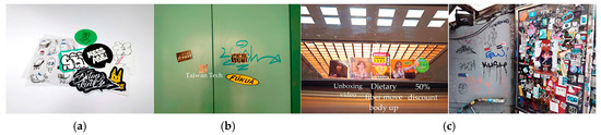 Graffiti stickers: (a) purchased collections; (b) deployment outside and inside an elevator; and (c) deployment on a bulletin board.
