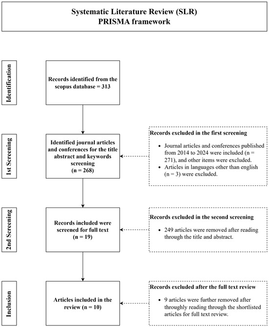 Adhering to the PRISMA framework, the systematic review process identified 313 records from the Scopus database using structured search strings. During the first screening, journal articles and conference proceedings published between 2014 and 2024 were included (n = 271). Given the accelerated development of BIM, VR, and body sensor networks (BSN) over the past decade, this period was deemed appropriate. Meanwhile, 45 records that did not meet this timeframe threshold were excluded. Additionally, three articles in languages other than English were excluded, leaving 268 articles for the next stage. These 268 articles were further evaluated in the second screening based on their titles and abstracts. This step identified 19 articles as relevant for full-text screening, while 249 articles were excluded due to a lack of relevance to the research focus, like not addressing the conceptual design phase or BIM frameworks or insufficient methodological rigor. The inclusion criteria at this stage ensured that only high-quality and relevant literature was carried forward. In the final screening phase, the 19 shortlisted articles underwent a detailed full-text review, excluding 9 articles that lacked alignment with the study objectives. Ten articles were included in the review, reflecting a rigorous and transparent filtering process that ensured the reliability and relevance of the selected studies. The entire SLR process followed is illustrated in Figure 3. During the data analysis phase of our study, information using VOSviewer version 1.6.20 software to generate a network map showing how keywords appear together in the abstracts helped uncover themes and connections within the research literature [62,63,64]. By evaluating the network clusters and the shortlisted journals from the SLR process, the larger trends and possibilities for new connections were identified.