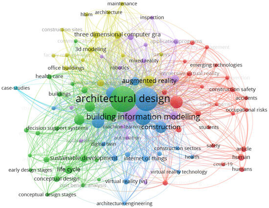 A total of 268 research documents were identified through a quantitative literature analysis. To better understand the relationships and trends within the data, a network map was created by inputting bibliographic information into the VOS viewer tool [53,54,55]. These data were formatted as a comma-separated value file, allowing for an analysis of how frequently keywords from the abstracts appeared together. The purpose of this approach was to identify larger patterns, themes, and clusters of interconnected concepts across the literature. The results of the co-occurrence network analysis, presented in Figure 4, revealed a notable finding. There were no significant connections between the central concept of the BIM and other related topics, such as conceptual architectural design, decision support systems, VR, or healthcare. This lack of strong connections suggests that there is a gap in the research exploring the intersections of BIM with these other domains. The findings highlight areas in need of further investigation, particularly where multiple concepts could be integrated for more interdisciplinary research and innovation.