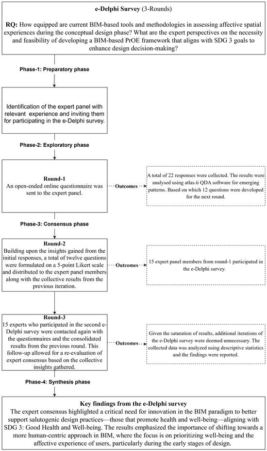 The e-Delphi survey was meticulously designed to engage architects with substantial expertise in both practice and academia, particularly those experienced in BIM. The following questions were framed to guide the e-Delphi survey. How equipped are the current BIM-based tools and methodologies in assessing affective spatial experiences during the conceptual design phase? What are the expert perspectives on the necessity and feasibility of developing a BIM-based PrOE framework that aligns with SDG 3 goals to enhance design decision-making? Figure 5 outlines the key processes and findings of the e-Delphi survey.
