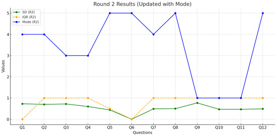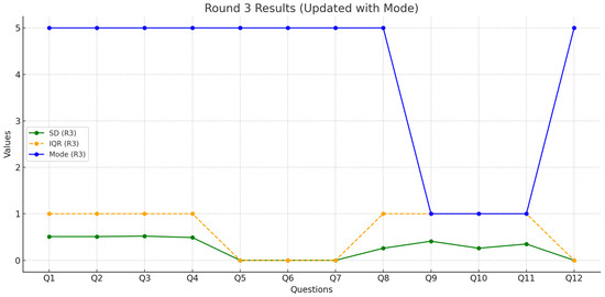 Patterns across the survey reveal consistent improvement in consensus between rounds 2 and 3. High-consensus questions, such as Q5 and Q9, reflect strong alignment among experts, with minimal variability and convergence toward maximum ratings (mode = 5). Conversely, questions like Q3 and Q8 exhibited higher variability, with some divergence in opinions despite a consistent mode of five, suggesting areas for ongoing discussion and refinement. The key insights from the observed results are discussed in the following section.