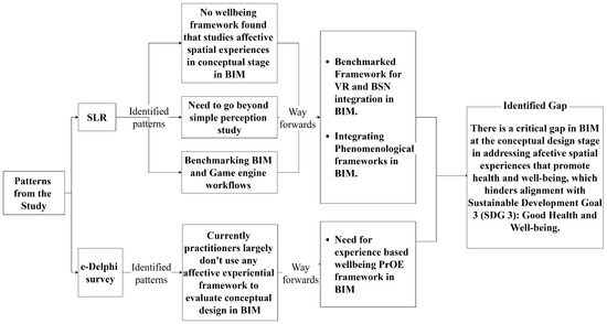 The findings from the SLR, along with insights from the e-Delphi surveys depicted in Figure 8, reveal shortcomings in the incorporation of BIM with advanced architectural design approaches such as EBD. Both sources underscore the necessity for BIM practices by highlighting the absence of approaches for merging BSNs with methodologies such as neuroarchitecture and neurophenomenology within BIM systems. The research highlighted the importance of the design stage and stressed the need to compare processes that combine BIM with VR-focused game engine platforms while highlighting the significance of focusing on user satisfaction and health concerns. On the other hand, the findings from the e-Delphi survey propose a more people-centered approach to BIM by recommending the inclusion of emotional and aesthetic elements and suggesting advancements to address current limitations within BIM tools to promote comprehensive and health-promoting design methods. The findings indicate the importance of developing an approach to boost BIM’s impact, shaping health-promoting spaces, and focusing on wellness and user satisfaction right from the initial design phases.