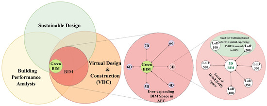 The knowledge gap highlighted by the SLR and e-Delphi survey pertains to Green BIM within the context of BIM maturity level 2. This gap is situated at the convergence of sustainable design principles, building performance analysis, and the utilization of BIM, in VDC. Green BIM focuses on energy performance and sustainability assessments by examining BIM’s role in optimizing energy efficiency, predicting environmental impacts, and supporting sustainable building practices throughout a building’s lifecycle [70]. Based on Hui [84], BIM has expanded beyond 3D modeling to 7D, incorporating elements such as time scheduling, cost estimation, sustainability, and facility management, as illustrated in Figure 9. Although there have been advancements, BIM methodologies still fall short in emphasizing spatial experiences centered around well-being during the initial design phases (LoDs 100 and 200).