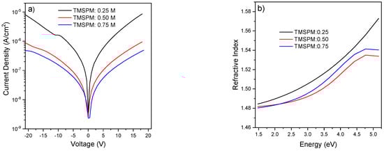 (a) Current versus voltage and (b) refractive index versus photon energy of SiO2–PMMA (1:1) hybrid films deposited with different TMSPM molar concentration in the hybrid precursor solution.
