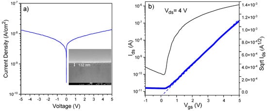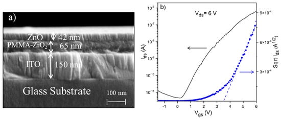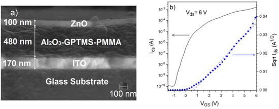 For the PMMA–TiO2 hybrid system, MMA and TBT (titanium butoxide) are used as organic and inorganic precursors, respectively. In this hybrid system, TMSPM enhances the integration of the organic and inorganic phases, leading to homogeneous and highly transparent hybrid dielectric layers with a low surface roughness of 0.36 nm. The hybrid films were deposited by spin coating from a precursor solution containing the precursors TBT: TMSPM: MMA with the molar ratio 1.0:0.25:0.25. After deposition, the hybrid films were annealed in air at 100 °C. The PMMA–TiO2-based TFTs were assembled on ITO-coated glass substrates, employing also ZnO-sputtered channel layers [42], as shown in the SEM cross-section image in Figure 4a. The assembled devices showed proper electrical behavior in the enhancement mode, as shown in the transfer curve in Figure 4b. From this transfer curve, the determined parameters of the PMMA-TiO2-based TFTs were a saturation mobility of 0.1 cm2/Vs, threshold voltage of 2.8 V, and Ion/Ioff current ratio of 103 [42].