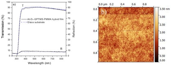 (a) Optical transmission and reflection spectra and (b) 2D AFM image of the Al2O3–GPTMS–PMMA hybrid dielectric film.