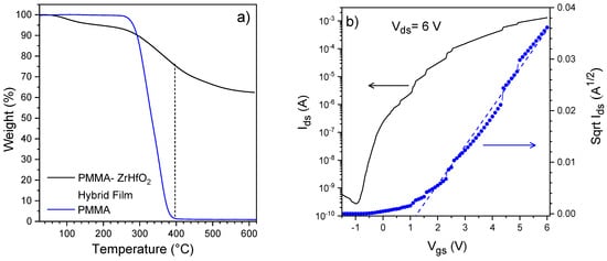 (a) Thermogravimetric plot of the PMMA–ZrHfO2 hybrid film and of PMMA; (b) Transfer curve of the ZnO-based TFT with PMMA–ZrHfO2 hybrid gate dielectric (left y-axis) and Sqrt Ids versus Vgs plot (right y-axis).