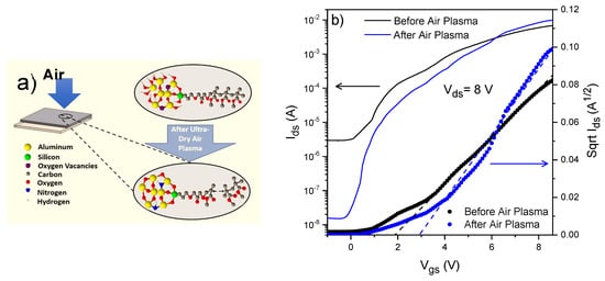In our recent paper [128], we addressed the challenges posed by oxygen vacancies and hydroxyl (OH) groups within Al2O3–GPTMS–PMMA hybrid dielectric layers and their impact on IGZO-based TFT performance. To overcome these issues, we implemented an ultra-dry air plasma treatment on the surface of the Al2O3–GPTMS–PMMA hybrid dielectric films, aiming to reduce the concentration of OH groups and passivate the oxygen vacancies within the hybrid dielectric network. The plasma treatment effectively reduced the density of these defects, as confirmed by FTIR and XPS analyses. The reduction of OH groups and passivation of oxygen vacancies not only improved the hybrid dielectric properties but also enhanced the interface quality between the dielectric and the a-IGZO semiconductor channel. The treated hybrid dielectric layers exhibited significantly lower leakage current densities, indicating improved insulation characteristics. This enhancement was attributed to the plasma-induced incorporation of nitrogen and oxygen atoms, which neutralized the oxygen vacancies, thereby reducing their ability to trap charges. Figure 10a shows the scheme of the air plasma process and the composition effects on the hybrid dielectric films. Additionally, the treatment promoted the formation of a smoother dielectric surface, further decreasing the interface trap density. This led to the fabrication of a-IGZO TFTs with superior electrical performance, including a high field effect mobility (up to 29.3 cm2/V·s), low threshold voltage (2.9 V), and high on/off current ratio (106), as can be seen in the transfer curves in Figure 10b, for the device before and after air plasma treatment. Moreover, the subthreshold swing (SS) was reduced from 1.25 to 0.42 V/dec, indicating efficient charge transport and low power consumption. This demonstrated that the ultra-dry air plasma treatment is an effective strategy to mitigate the negative effects of oxygen vacancies and OH groups in hybrid dielectric layers. By improving the dielectric insulating properties and the dielectric/semiconductor interface quality, we achieved high-performance TFTs suitable for advanced electronic applications.