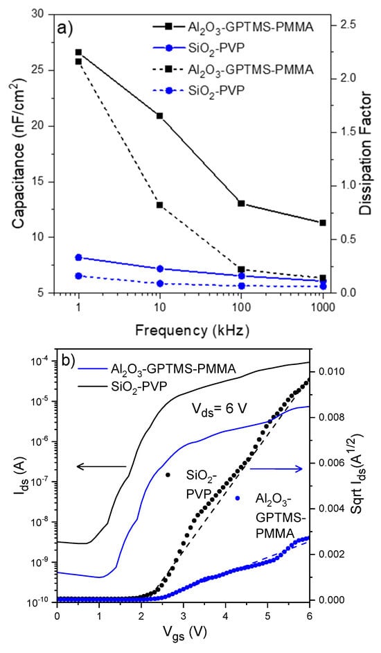 In the recent paper by de Urquijo Ventura et al. [129], SiO2–PVP and Al2O3–GPTMS–PMMA hybrid gate dielectric layers were compared on sputtered CdSe-based TFTs. The PVP-based hybrid demonstrated superior performance characteristics, which can be attributed to the unique properties of PVP. The PVP advantage lies in its ability to form a more homogeneous dielectric layer with fewer interfacial defects, especially when it is crosslinked with PMF (poly (melamine-co-formaldehyde) methylated) before being combined with inorganic oxides like SiO2. In this study, the SiO2–PVP dielectric exhibited a smooth surface with a low root mean square (RMS) roughness of 0.27 nm, indicating an adequate interaction between the organic and inorganic phases. This smoothness is crucial for the subsequent deposition of the semiconductor layer, leading to a better dielectric/semiconductor interface. Furthermore, the dielectric properties of the SiO2–PVP layer showed a relatively steady capacitance across frequencies and a lower dissipation factor compared to the Al2O3–GPTMS–PMMA dielectric, suggesting lower dielectric dispersion and fewer charge-trapping defects, as can be observed in Figure 11a. When applied as a gate dielectric in sputtered CdSe-based TFTs assembled on ITO-coated glass substrates, the SiO2–PVP gate dielectric achieved an impressive field effect mobility of 22.2 cm2/V·s, a low threshold voltage of 1.1 V, and an on/off current ratio of 104, as observed in the transfer curves of the devices in Figure 11b. These performance metrics highlight the PVP-based dielectric’s ability to facilitate efficient charge transport and minimize interfacial charge trapping. In contrast, the Al2O3–GPTMS–PMMA-based TFTs showed diminished performance, primarily due to the presence of a higher concentration of hydroxyl groups and oxygen vacancies, which acted as trap states. These defects in the Al2O3–GPTMS–PMMA hybrid material increased charge trapping at the interface, restricting the electrical transport in the semiconductor channel and resulting in lower field effect mobility.