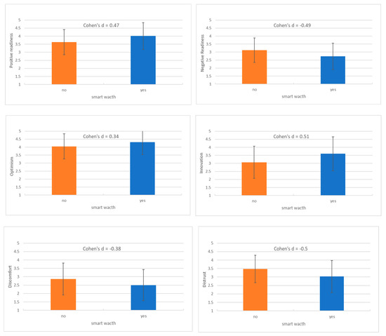 People using SSW rated themselves significantly (p < 0.05) and substantially higher than their non-SSW users on positive readiness for technology (d = 0.47), and specifically on optimism (d = 0.34) and innovation (d = 0.51). Moreover, users of SSW reported significantly (p < 0.05) and substantially lower negative readiness for technology than their non-SSW users’ counterparts (d = −0.49), and specifically on discomfort (d = −0.38) and distrust (d = −50).