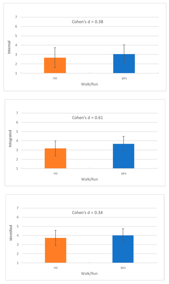 The MANOVA also revealed a significant multivariate walk/run effect on the motivation to exercise dimensions, Wilk’s λ = 0.92, F(6,229) = 2.93, p < 0.006, ƞ2 = 0.08, and consequently on internal, integrated, and identified motivations (see Table 1 and Figure 3). Adolescents who walk/run reported being more internally motivated (d = 0.38), integrated (d = 0.61), and identified (d = 0.34) than their sedentary counterparts. The mean values of these motivational dimensions were low for both active and sedentary people.