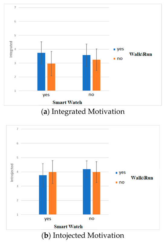 The findings also showed that SSW users who walk/run scored higher on integrated motivation than those who refrained from exercising, but both were low on this motivational dimension. A similar, but smaller, difference was noted among non-SSW users. It is therefore clear that it is the exercise which is more associated with the integrated motivational dimension. In other words, integrated motivation for exercising was more related to the mere act of exercising rather than to the SSW use. Relying on Ryan and Deci’s [22] SDT, the mean values of the integrated motivation show that people who walk/run feel more integration between their goals, values, and actions than their non-exercise counterparts. This motivational state is not yet internalized, but walkers and runners felt accomplishment of the goals and values more than sedentary exercisers regardless of wearing SSWs. The significant effect of walking/running on the internal, integrated, and identified motivation dimensions where walkers/runners rated themselves higher than those who refrained from exercising (see Figure 3), indicating that motivation for exercise is independent of motivation to use the SSW technology. The low mean values assigned by all the adolescents to these dimensions call for the use of other motivation frameworks to study motivation related to technology use.