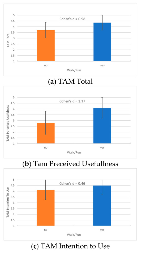 Walkers and runners were significantly and substantially higher than those who refrained from walking and running in readiness to use smart phones (total TAM; d = 0.98), showed higher usefulness of them (d = 1.37), and intended to use them (d = 0.46).