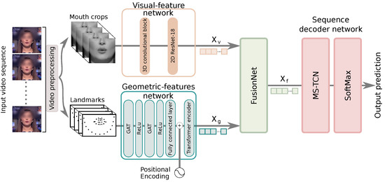 Outline of the proposed approach. Video preprocessing: crops the mouth region from the input video sequence and obtain the corresponding facial landmarks. Visual-feature network: extracts relevant information from the preprocessed data. Geometric-feature network: encodes lip contour variation delivered by facial landmarks. FusionNet network: fuses the encoded features. Sequence backend network: based on a multi-scale temporal convolutional network (MS-TCN) to encode temporal variation and classify the input video sequence.