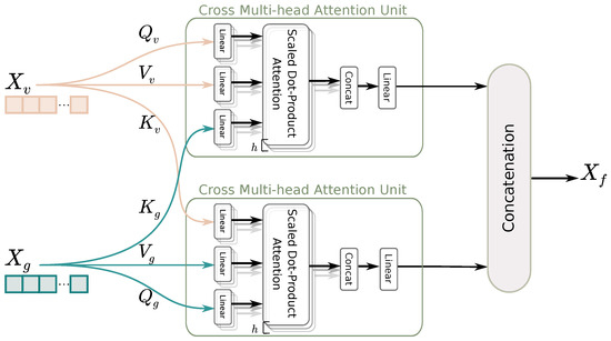The proposed FusionNet is based on a multi-head attention mechanism to aggregate the fused features from both the visual and geometric features extracted from their corresponding networks. We keep the original notation as in the original description of the Transformer architecture [47]. As illustrated in Figure 2, it consists of two multi-head attention modules that exchange their K (key) features. The idea behind this design is to integrate features from both modalities. After applying the multi-head attention unit involving h heads, we concatenate the obtained features into one single feature map, denoted by with . The multi-modal fusion process is mathematically represented in Equation (1):