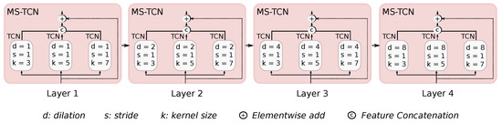 Sequence decoder network with four layers of multi-scale expanded TCNs with 1, 2, 4, and 8 dilation values, respectively. Each layer is composed of three TCN units with 3, 5, and 7 kernel values.