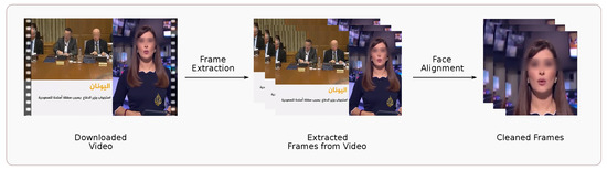 In this section, we present an overview of the procedures followed to collect and prepare our large-scale dataset for Arabic lipreading. The fundamental concept was to gather videos of individuals speaking in Arabic in front of cameras from the YouTube platform, which is a rich source of diverse and natural language data. The process involved several stages, including video scrapping, shot boundary detection, face detection and tracking, data cleaning, annotation, video split, and data cropping, as illustrated in Figure 4. A diverse set of Arabic videos was collected and preprocessed to extract the frames of interest for lipreading. The frames were then annotated with the corresponding spoken words to create a ground truth for training and evaluation purposes. Finally, the annotations were visually validated to ensure their accuracy and consistency. Each of these steps will be described in detail in the following sections. The LRW-AR dataset is released under a BY-NC-ND license, and is accessible through the following link: https://osf.io/rz49x (accessed on 27 December 2024).
