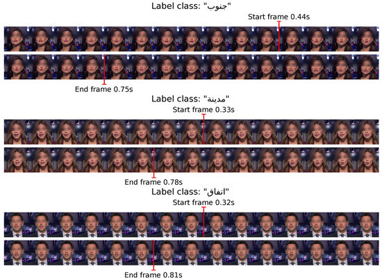 For dataset annotation, we utilized the Vosk speech recognition system (https://alphacephei.com/vosk/, accessed on 10 September 2024) to automatically transcribe the spoken words in the video sequences into Arabic text. The use of Vosk not only facilitated transcriptions but also established boundaries, indicating the start and end of each spoken word within the text. While we anticipated a perfect alignment between text and audio data, there were some instances where the transcription was incorrect. To rectify this, manual correction of these errors was performed during the final phase of visual validation and dataset quality control.