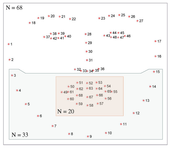 The process involves choosing N facial landmark points, which are points used to identify and analyze facial features. The total number of facial landmarks is 68, of which 33 are situated in the lower half of the face (marked by a blue box), and 20 are concentrated in the mouth region (marked by an orange box).