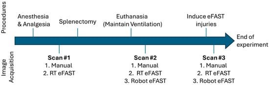 Overview of animal study procedures and image capture timepoints. Ultrasound images were captured prior to splenectomy in live swine, as well as at two time points in euthanized swine (before and after eFAST injury induction). Each scan landmark in the diagram lists how US images were captured. The three approaches were manual US image capture, image capture using the RT eFAST handheld application, and image capture using the robotic imaging platform.