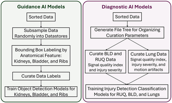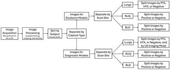 Ultrasound data from 36 pigs were exported from the US machine and sorted by experimental phase, subject ID, and scan point for both major scan types: guidance (scans along anatomical planes) and diagnostic (scans focused on organs, fluid accumulation sites), as diagrammed in Figure 2. All ultrasound videos were split into frames, and individual images were cropped and resized to 512 × 512 pixels using the Image Processing Toolbox extension from MATLAB version R2023b (MathWorks, Natick, MA, USA). Images were cropped to remove words and other artifacts on the US scans that the AI model may have focused on during training. The US scans were reshaped to a 512 × 512 pixel size to create a symmetrical image geometry at a high resolution to detect small injury features. We have developed successful US AI models for similar applications using this image input size [23]. For guidance frames, datastore file types were created containing random samples of the data, with major anatomical features labeled with bounding boxes around them: ribs for thoracic scans, the kidney for RUQ, and the bladder for BLD. Once the labels were generated, images in which the feature was not obviously visible were removed from the dataset. The bounding box labels were exported from MATLAB as four coordinates: x, y of the top left corner, and x-length, y-length of the bounding box.
