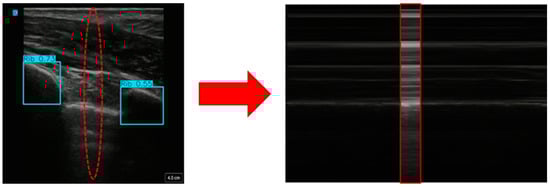 For the development of diagnostic models focused on the thoracic region, we first generated M-mode images from the original B-mode US scans. This approach used a sequence of consecutive frames to create custom M-mode images. Each frame was processed through the guidance model for rib detection and, based on the predicted rib locations, the central point between the ribs was calculated. At this central point, a vertical slice was extracted from each frame (Figure 4). These slices were then concatenated to generate an image that closely resembled a genuine M-mode image. To ensure that a generated M-mode image was indicative of its diagnosis, the rib detection guidance model was used to filter out images without only two ribs visible. If a frame did not have exactly two ribs detected, that set of subsequent frames was not used for the M-mode creation process.