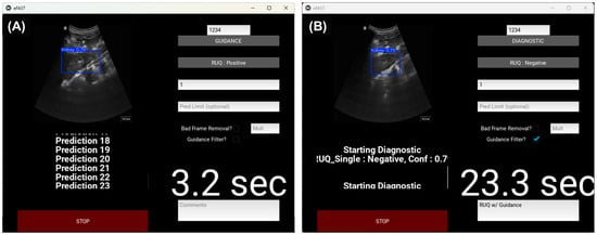Overview of the real-time eFAST application. Developed graphical user interface for (A) guidance AI model use and (B) diagnostic AI model use, with guidance filtering active. Representative screen shots shown for a RUQ scan site. The time refers to how long the application took to make predictions.