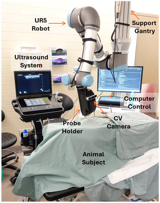 Overview of robotic configuration for automated eFAST in swine. Relevant features of the setup are labeled to better explain the experimental setup.