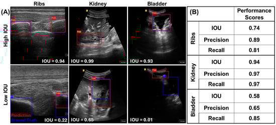 Guidance AI performance for each anatomical location. (A) Representative images are shown for high and low IOU scores for rib, kidney, and bladder predictions. (B) Testing performance scores for each anatomical guidance model for IOU, precision, and recall metrics.