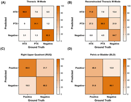 Diagnostic AI confusion matrices for each diagnostic model. (A) Three-class thoracic model using M-mode images; (B) three-class thoracic model using M-mode reconstructed from B-mode frames; (C) RUQ B-mode binary classification model; and (D) BLD B-mode binary classification model.