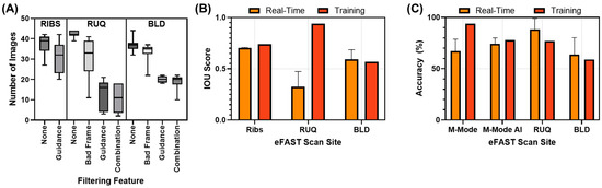 Next, we evaluated how the guidance models performed using the RT eFAST application. This was undertaken without any filtering methods applied to obtain an overall IOU performance metric for each scan site (Figure 9B). In real time, performance decreased for ribs (0.70 real time vs. 0.74 training) and more substantially for the RUQ (0.33 real-time vs. 0.94 training), while BLD performance slightly increased (0.59 real time vs. 0.57 training). In terms of diagnostics, the effects of these filters on overall diagnostic accuracy were minimal, so the averaged diagnostic accuracy results comparing training performance are shown in Figure 9C. Performance was comparable to training data, with the exception of the M-mode thoracic model, which had a reduced accuracy of 0.67 compared to 0.94 during model training.