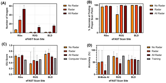 The robotic imaging platform relied on a computer vision model to identify each eFAST scan site automatically. The IOU scores for these predictions across scan sites were as follows: 0.51, 0.52, and 0.56 for ribs, RUQ, and BLD, respectively (Figure 10C). For US image capture, three approaches were used to capture images, as described in the Section 2, using the Robotic eFAST (RoboFAST) exam with AI model guidance: Radar, No Radar, and All Radar modalities. We first evaluated the effects of the various methods on the total number of images captured (Figure 10A). As anticipated, the All Radar approach captured the most images for each scan site, while No Radar and Radar had similar numbers of images for the RUQ and BLD scan sites. We next quantified the overall success of each scan site across the three swine subjects, where success is defined as at least one image being captured that could be used for diagnosis (Figure 10B). All approaches had high performance here, except for the RUQ/No Radar approach at 67% success. Factoring this in, Radar and All Radar had similar performance levels for this evaluation criterion. The guidance model IOU performance scores were similar for each RoboFAST imaging modality, with BLD having the highest IOU scores and RUQ performing the worst and having the highest subject variability (Figure 10C).