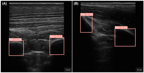 Once the data were labeled, the guidance AI models were trained using the YOLOv8 [24] object detection architecture, with separate models tailored specifically for the detection of the kidneys (9449 labelled US images), bladder (7039 labelled US images), or ribs (44,736 labelled US images). The training process utilized the YOLOv8-S pre-trained model weights, default training parameters, and 100 epochs to provide ample opportunity for the models to learn and refine their predictions. To ensure robust model validation, a distinct dataset from subjects not used in training was reserved for the holdout testing of model performance. YOLOv8 was selected as the model architecture due to a variety of advantages when compared with other state-of-the-art object detection models. Primarily, this effort focused on the real-time application of object detection models with an eFAST-focused purpose. This meant that speed of prediction time was of high importance, even at the expense of slightly reduced accuracy. This narrowed the scope of possible models to be used to ‘single-stage’ architectures, where the single-stage model undertakes a single pass through of the image through the layers to determine the object location and class. Models like Faster R-CNN, which can be more accurate, have a slower prediction time due to the image being processed into proposed regions of interest before being classified for objects. Moreover, when looking at single-stage models, YOLOv8 was amongst the fastest in frames per second, even beating out the single-shot detector (SSD) model and having only a slightly worse detection accuracy [25,26]. Ease of use was also a driving factor for the use of YOLOv8 in this environment. The Python library ultralytics [27] provides an API to allow for the seamless integration of YOLO models into existing software.