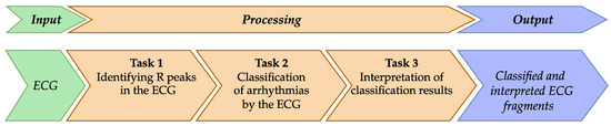 Figure 2. This figure outlines a three-task ECG arrhythmia classification approach using XAI. It starts with ECG input and proceeds through R peak identification, arrhythmia classification, and result interpretation, resulting in classified ECG fragments. This approach integrates domain knowledge to improve diagnostic accuracy and interpretability for clinicians.