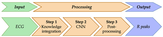 Figure 3. This figure illustrates the R peak detection method in ECG analysis, consisting of three key steps: knowledge integration, CNN processing, and post-processing. This method leverages domain knowledge of the reference heart cycle to enhance R peak detection accuracy, producing precise R peak locations in the output.