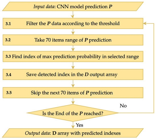 Step 3 is designed to process the CNN output P, transforming it into indices corresponding to R peaks in the input signal. The scheme of Step 3 is shown in Figure 6.