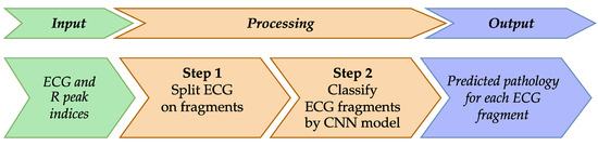 Figure 7. This figure presents an ECG classification method for arrhythmia detection, beginning with ECG and R peak indices. The process involves splitting the ECG into fragments and using a CNN model to classify each fragment, resulting in predicted pathology labels for individual ECG segments to support clinical diagnosis.